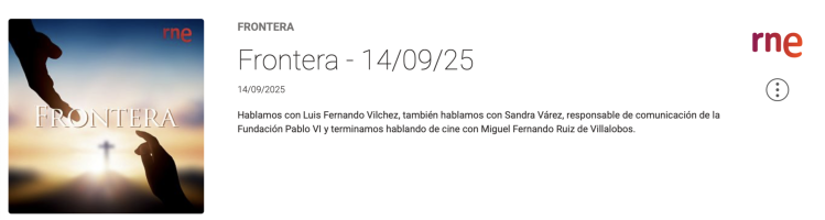 “FRONTERA” es un programa de RNE, de entrevistas, basado en el diálogo entre la fe y la razón. Es una realidad que el hombre, a lo largo de la Historia, está abierto a lo universa y a lo transcendente. Este camino de búsqueda es iluminado por la fe, que está también impregnada por la cultura y la sociedad a la que pertenecemos y a su vez influye en ellas. La clave consiste en conciliar la secularizad de la sociedad con las exigencias radicales del Evangelio.