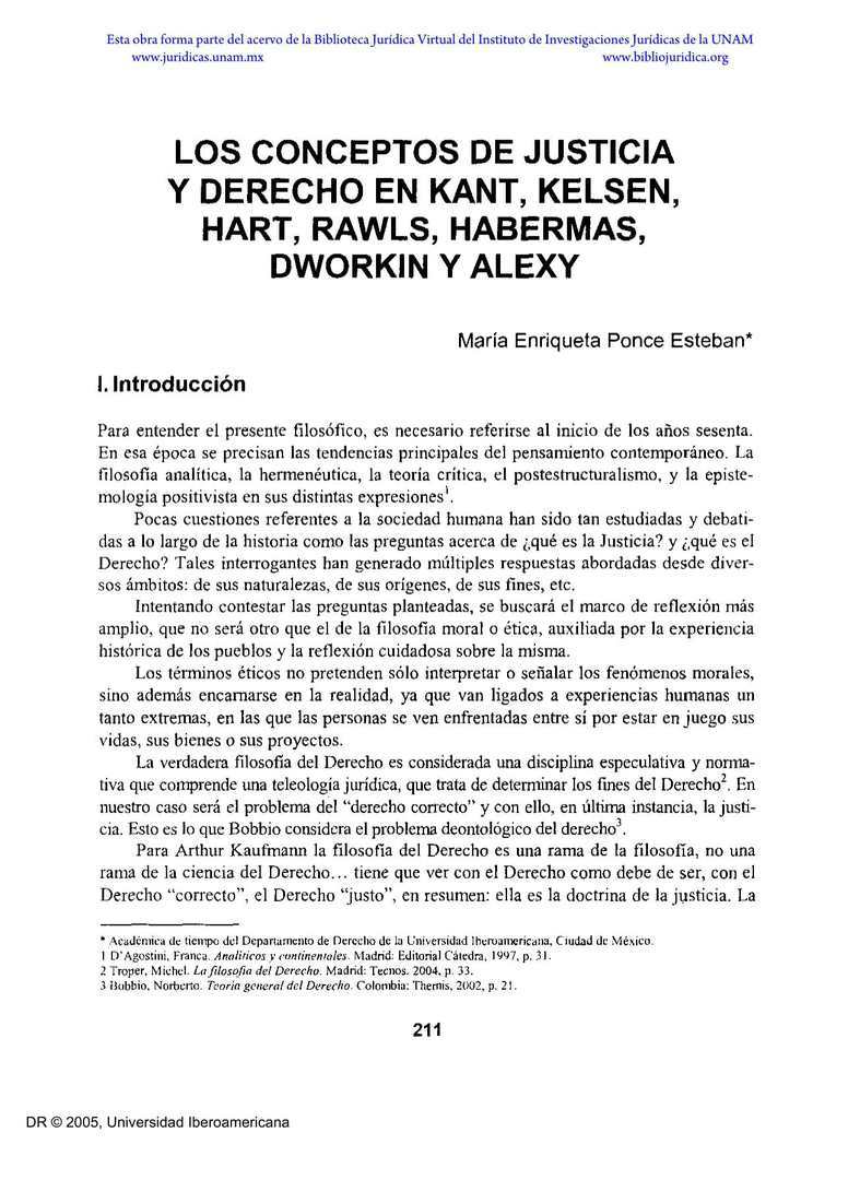 LOS CONCEPTOS DE JUSTICIA Y DERECHO EN KANT, KELSEN, HART, RAWLS, HABERMAS, DWORKIN, y ALEXI POR María Enriqueta Ponce.